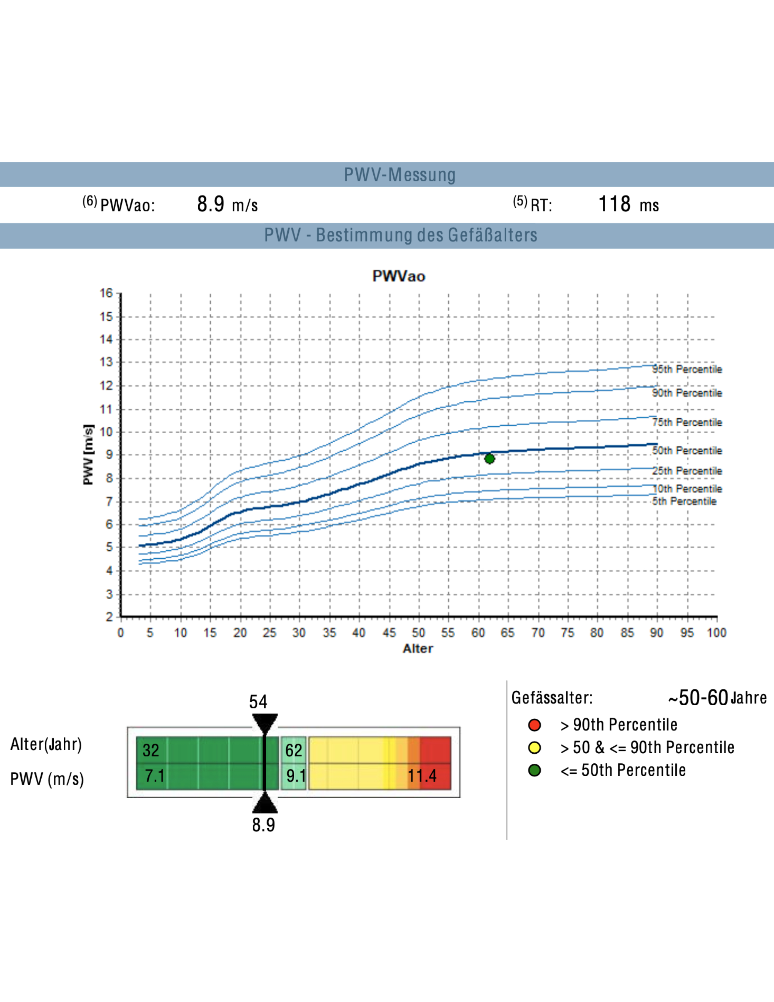 Neben der Pulswellengeschwindigkeit können wir andere Parameter messen, die uns den Zustand Ihrer Gefäße näher beschreiben. Dies ist für Sie in Form des errechneten Gefäßalters nachvollziehbar, d.h. Sie erhalten direkt Information darüber, ob Ihre Gefäße vorgealtert sind, ihrem Alter entsprechen oder vielleicht sogar weniger gealtert sind im Altersvergleich.